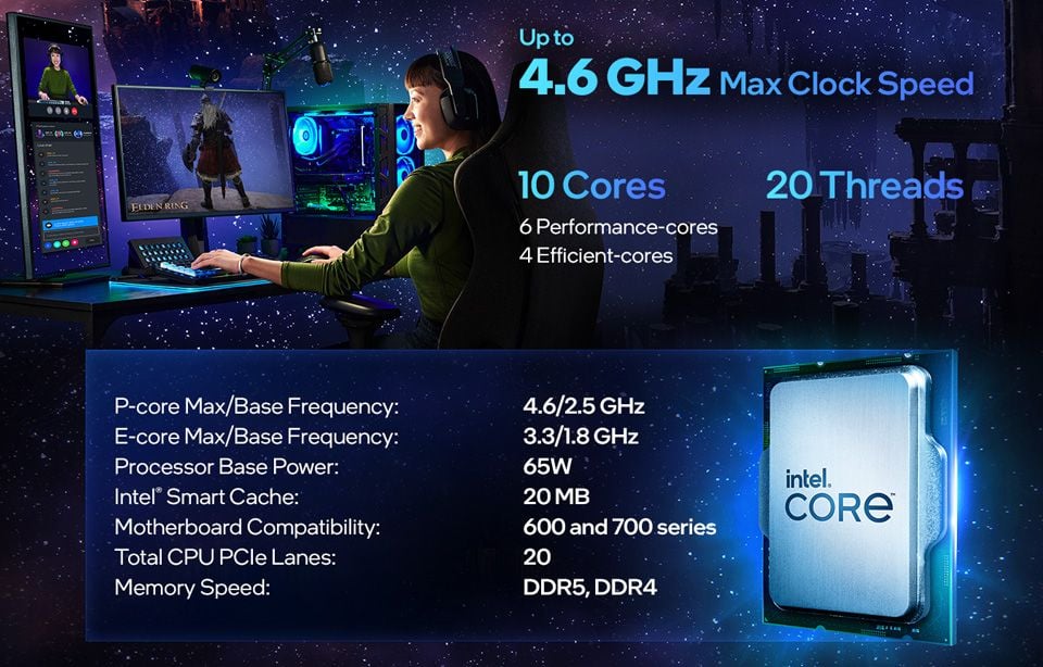 Nhìn vào thông số kĩ thuật do Intel công bố, Core i5 13400F có 10 nhân, 16 luồng cùng bộ nhớ đệm lên tới 20GB, tốc độ tối đa đạt 4.6 GHz, có thể thấy đây là sự cải tiến đáng chú ý đối với phiên bản Core i5 13th lần này. Thiết kế kết hợp P-core và E-core cho tăng khả năng đa nhiệm hay xử lí các tác vụ phức tạp tốt hơn so với phiên bản tiền nhiệm. Số nhân xử lí cao không chỉ cho hiệu năng mạnh mẽ mà còn tiết kiệm điện năng.