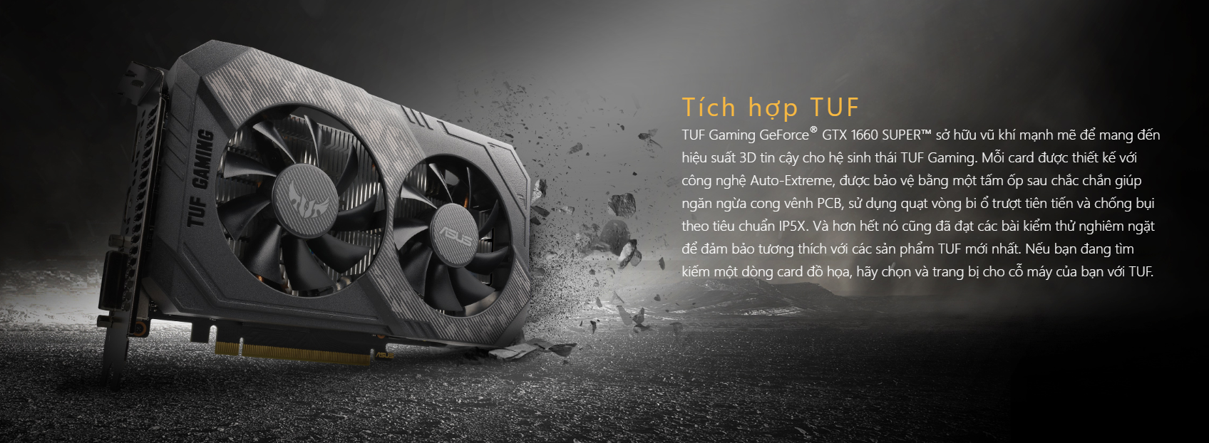 TUF Gaming GeForce GTX 1660 SUPER sở hữu vũ khí mạnh mẽ để mang đến hiệu suất 3D tin cậy cho hệ sinh thái TUF Gaming. Mỗi card được thiết kế với công nghệ Auto-Extreme, được bảo vệ bằng một tấm ốp sau chắc chắn giúp ngăn ngừa cong vênh PCB, sử dụng quạt vòng bi ổ trượt tiên tiến và chống bụi theo tiêu chuẩn IP5X. Và hơn hết nó cũng đã đạt các bài kiểm thử nghiêm ngặt để đảm bảo tương thích với các sản phẩm TUF mới nhất. Nếu bạn đang tìm kiếm một dòng card đồ họa, hãy chọn và trang bị cho cỗ máy của bạn với TUF.