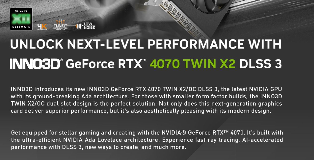 Tên sản phẩm : VGA Inno3D Geforce RTX 4070 TWIN 12GB X2 OC DDR6X 2Fan( N40702-126XX-185252N)