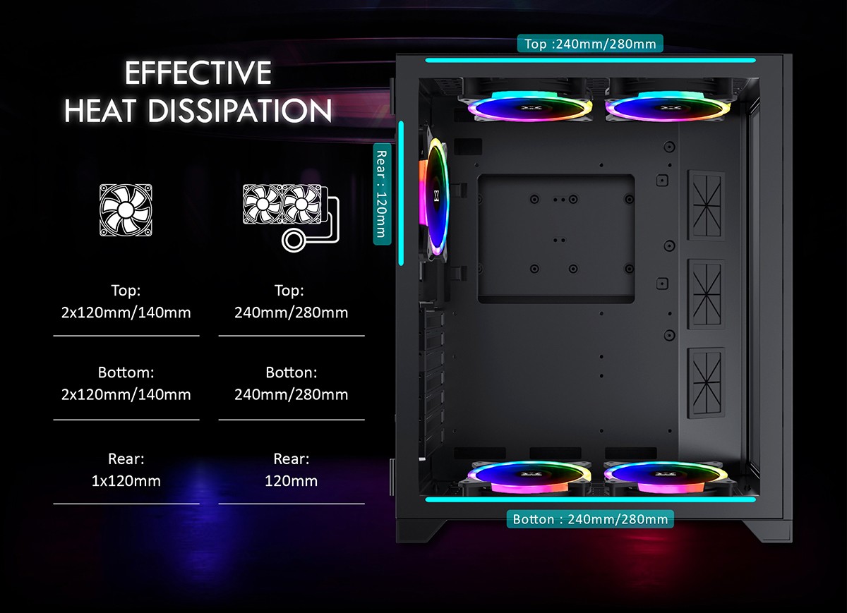 Hỗ trợ Quạt | Trên: 2 x 120 mm hoặc 2 x 140 mm Dưới: 2 x 120 mm hoặc 2 x 140 mm Sau: 1 x 120 mm |